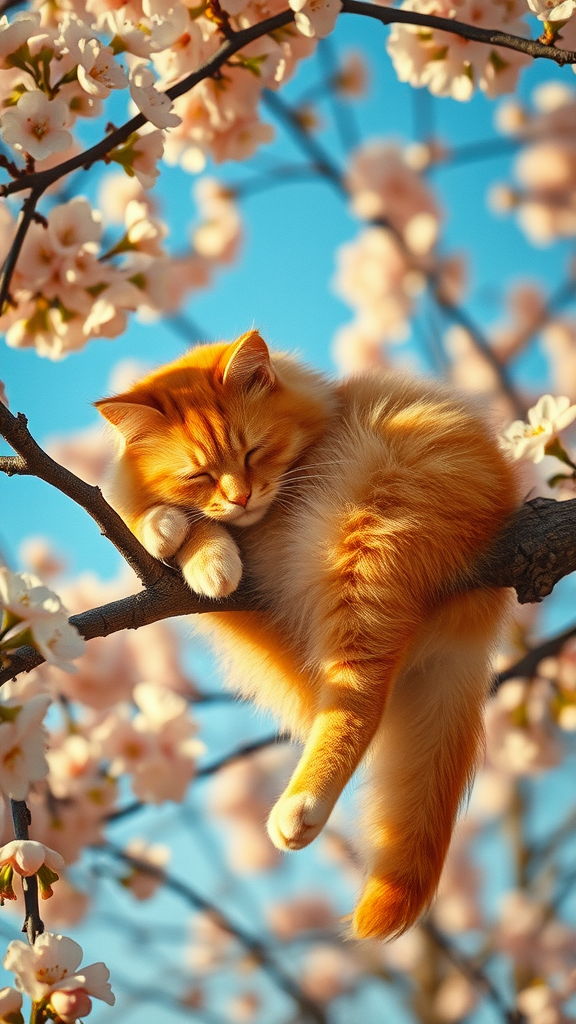 A film photo captures a ginger fluffy cat napping on a blooming tree branch, its hind legs dangling lazily, bathed in golden, cinematic sunlight with vibrant blossoms framing its serene pose.