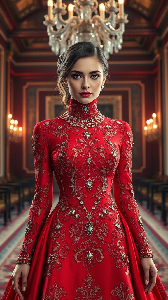 A stunning woman in a red turtleneck dress, intricately adorned with rubies and sparkling diamonds, flaunts a breathtaking ensemble in a sci-fi Victorian room. This fashion masterpiece, crafted from soft silk with detailed brocade textures, features exceptional craftsmanship and sophistication. At a grand fashion show, under cinematic 8k and 4k lighting, she exudes beauty, reminiscent of bridal elegance, transforming the great hall into a scene of marvel. Her symmetrical, full-body presence is captured in ultra-realistic, highly detailed wedding photography, echoing the artistry of Peter Mohrbacher.