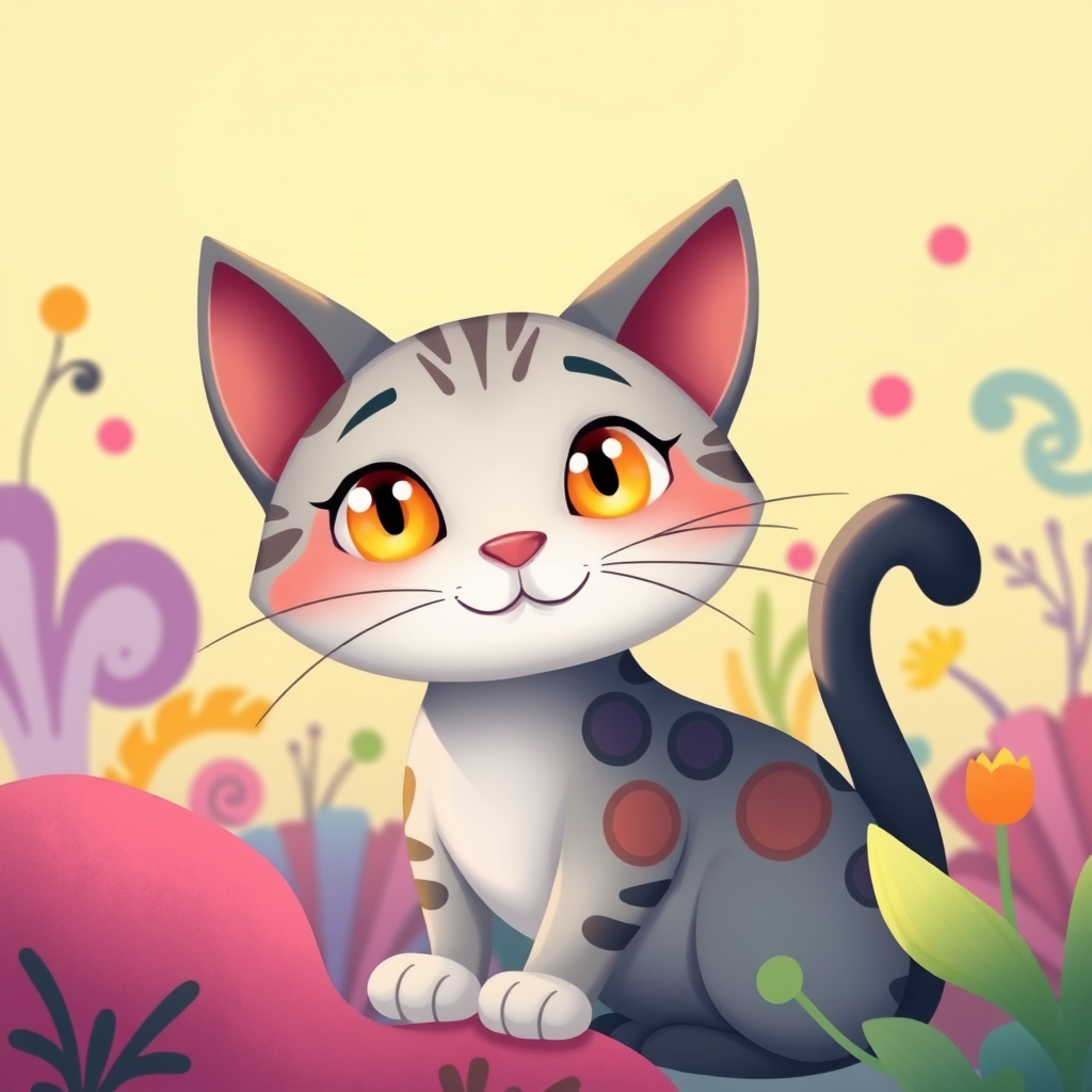 Cute cat illustration for a children's storybook inspired by the style of Tarsila do Amaral, featuring a whimsical and colorful setting. The cat has a playful expression with bright, expressive eyes and a slightly elongated neck, adding to its charm. The artwork showcases vibrant patterns and fluid shapes, capturing a sense of joy and imagination. The illustration is rendered in high-definition with a clean, detailed finish, ensuring clarity and appeal for a young audience. The scene is cohesive and captivating, emphasizing the fantastical elements of a child's narrative world.