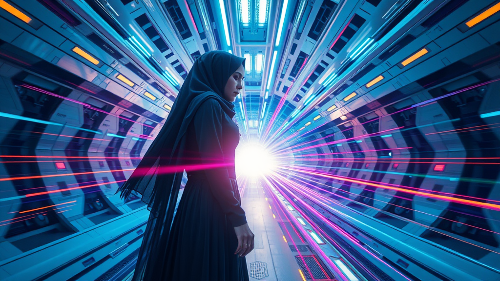 A Hijabi Muslim girl with sleek cyberpunk prosthetics stands gracefully in her elegant Islamic dress, her long hair cascading. Inside a cutting-edge spaceship with a futuristic design, the environment is alive with vibrant colors and intricate details. A powerful laser emanates from the center, casting brilliant beams through the air, while ethereal energy clots form mesmerizing patterns. The scene is captured with photorealistic precision, showcasing hyper realistic textures and dynamic lighting. The sense of acceleration and speed is palpable, enhanced by streaks of light and vibrant flashes. This cinematic moment, rendered in 8K super resolution, invites the viewer into a breathtaking Sci-fi world of advanced technology and spiritual elegance, captured in a stunning long exposure image.