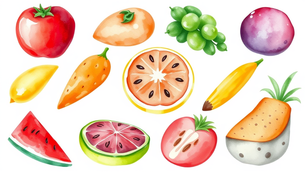Watercolor illustration of colorful food items, each distinct and on a plain white backdrop, featuring no shadow effects, bright and vibrant hues, with attention to detail and texture, capturing the essence of each item beautifully and whimsically.