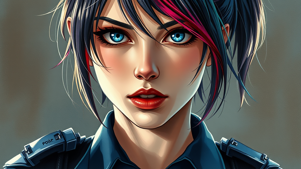 A young woman in a police uniform reminiscent of Jill Valentine from Resident Evil 3, with beautifully intricate colored hair. An anime portrait showcasing hard shadows and strong rim light, resembling a watercolor style using traditional materials. Inspired by the artistry of Juan Gimenez, Atey Ghailan, and Sachin Teng, features include deformed elements, with unique interpretations of eyes and lips, seen in a medium shot.