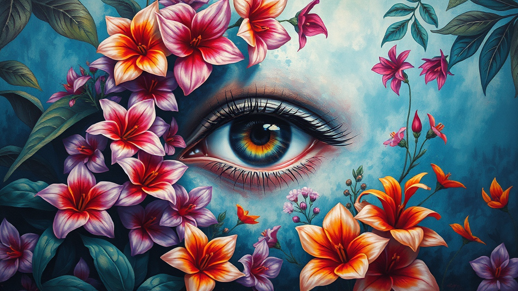 A captivating painting featuring an eye surrounded by an enchanting array of purple and orange flowers, evoking the intricate style of James Jean. The scene is set within a mysterious jungle, infused with hints of Martin Ansin’s artistry. The composition showcases influences from Papua New Guinea art, incorporating a palette of light blue and red hues. The artwork is depicted in an exceptionally detailed 32k UHD resolution, with a poster-like quality, maintaining an abstract yet harmonious flow, adding an ethereal and enigmatic aura to the overall design.