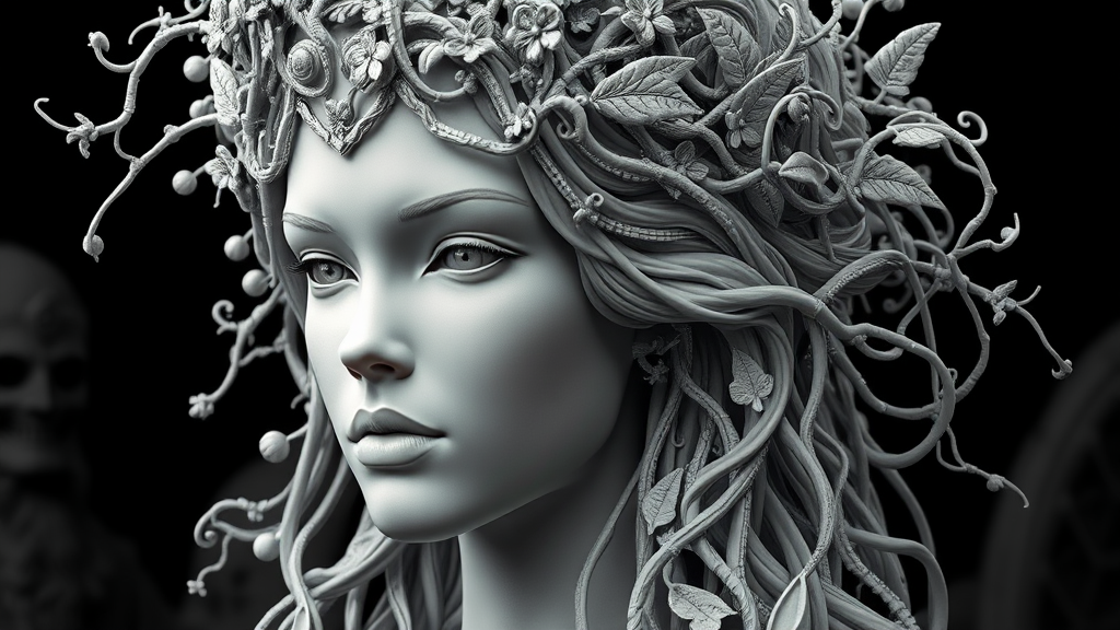 A hyper-realistic sci-fi sculpture of a woman adorned with an intricate and elaborate crown, crafted in black and white, her expression serene and enigmatic, the crown flowing with delicate patterns of intertwining vines and subtle textures of leaves and flora, showcasing detailed nature depictions through advanced ZBrush techniques, set against a backdrop that hints at an otherworldly landscape.