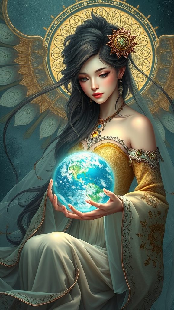 A mystical young woman in an ornate flowing dress gently cradles a luminous globe, embodying the essence of an earth goddess. The scene is rendered in a stunning blend of realistic fantasy art, showcasing intricate details and vibrant colors. Her features are reminiscent of a graceful anime character, with influences of Artgerm and Atey Ghalian's styles evident in the illustration, along with the atmospheric touch of Guweiz. This enchanting digital artwork captures the serene power and beauty of mythology, creating a mesmerizing fantasy painting.