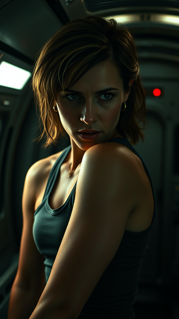 Epic cinematic 8k wallpaper featuring Ellen Ripley from the Alien movie, her face showing a mix of determination and fear. She's wearing a classic tank top and poised in an action stance. The half-body shot captures her forehead and cheeks glistening with sweat as she presses her back against the Nostromo space shuttle's cold, metallic walls. The scene unfolds in a dimly lit sci-fi setting, employing advanced ray tracing for dramatic rim lighting and intricate detail. The cinematic composition centers on her, highlighting the stoic intensity of her expression in a moody, high-contrast atmosphere with Rembrandt lighting effects. The use of shallow focus and RTX ray tracing lighting enhances the ultra-realistic feel, all rendered in Octane for unmatched detail at 8K resolution. The scene echoes the tension and grit of cinematic storytelling while incorporating subtle creative twists.