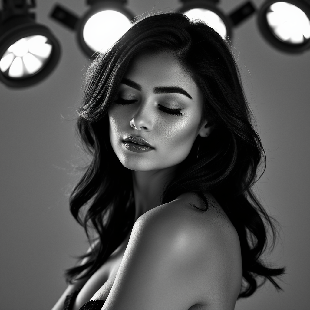 High-resolution professional portrait of a stunning dark-haired woman with closed eyes posed gracefully under studio lights, showcasing a blend of fashion and natural beauty. The black and white photography highlights her elegant form as dynamic backlighting creates a cinematic effect, capturing the essence of timeless sophistication and artistry.