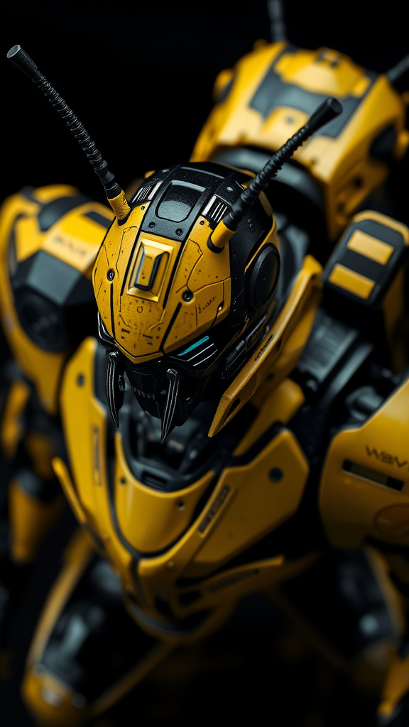 Black and yellow battle mech with intricate detailing, featuring a sci-fi mask with stunning detail and reflections on a yellow body, complemented by a jetpack. Insectoid-inspired sci-fi combat mech showcasing elaborate design elements and bright yellow polymer armor with unique identifying marks, incorporating natural textures and reflections. Set against a black background with an eerie and dramatic top-down view, capturing the essence of cinematic, ultra-high resolution, 8k hyper-realistic photography with Rembrandt lighting. The surrounding environment is neutral and softly blurred, enhancing the mech's visual impact.