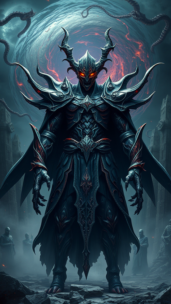 Arkthar the chaos necromancer, emanating an aura of fear and confusion as effortlessly as the wind disperses seeds of malevolence. The scene is portrayed on a grandiose scale, capturing every minute detail in a hyper-realistic style akin to a yugioh monster. Arkthar stands as a towering figure, with intricate armor shimmering under a dark, foreboding sky. His eyes glow with an otherworldly intensity, casting shadows that twist and turn like serpents. Behind him, a swirling vortex of dark energies pulses rhythmically, spreading tendrils of chaos that envelop the land. Dark mist rolls through ancient, crumbling ruins, revealing glimpses of spectral figures rising from the ground, obeying the necromancer's whispered commands. This evocative tableau blends elements of fantasy and dread, crafting an imagery of power and darkness intertwined.