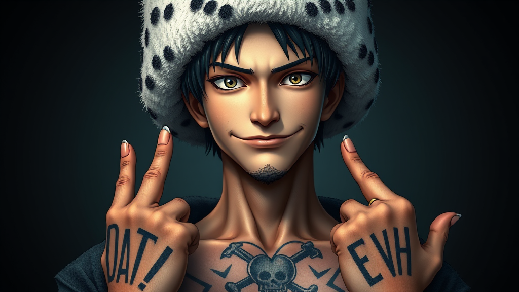 A strikingly realistic and meticulously detailed portrait of Trafalgar D. Water Law from One Piece, showcasing a slender young man of considerable height. He has a confident smirk on his face and wears a distinctive white northern-style fur hat adorned with a spotted pattern along the brim and bill. His short dark hair complements his sharp features, accented by dark sideburns and a neatly trimmed small goatee. On the back of each finger of his hands, the letters D E A T H are boldly tattooed in black. His chest displays a tribal-style heart tattoo featuring his iconic Jolly Roger. The scene is brought to life with cinematic lighting and high contrast, capturing the essence of character concept art on ArtStation in stunning 8K resolution, offering a fresh yet faithful interpretation of the character.