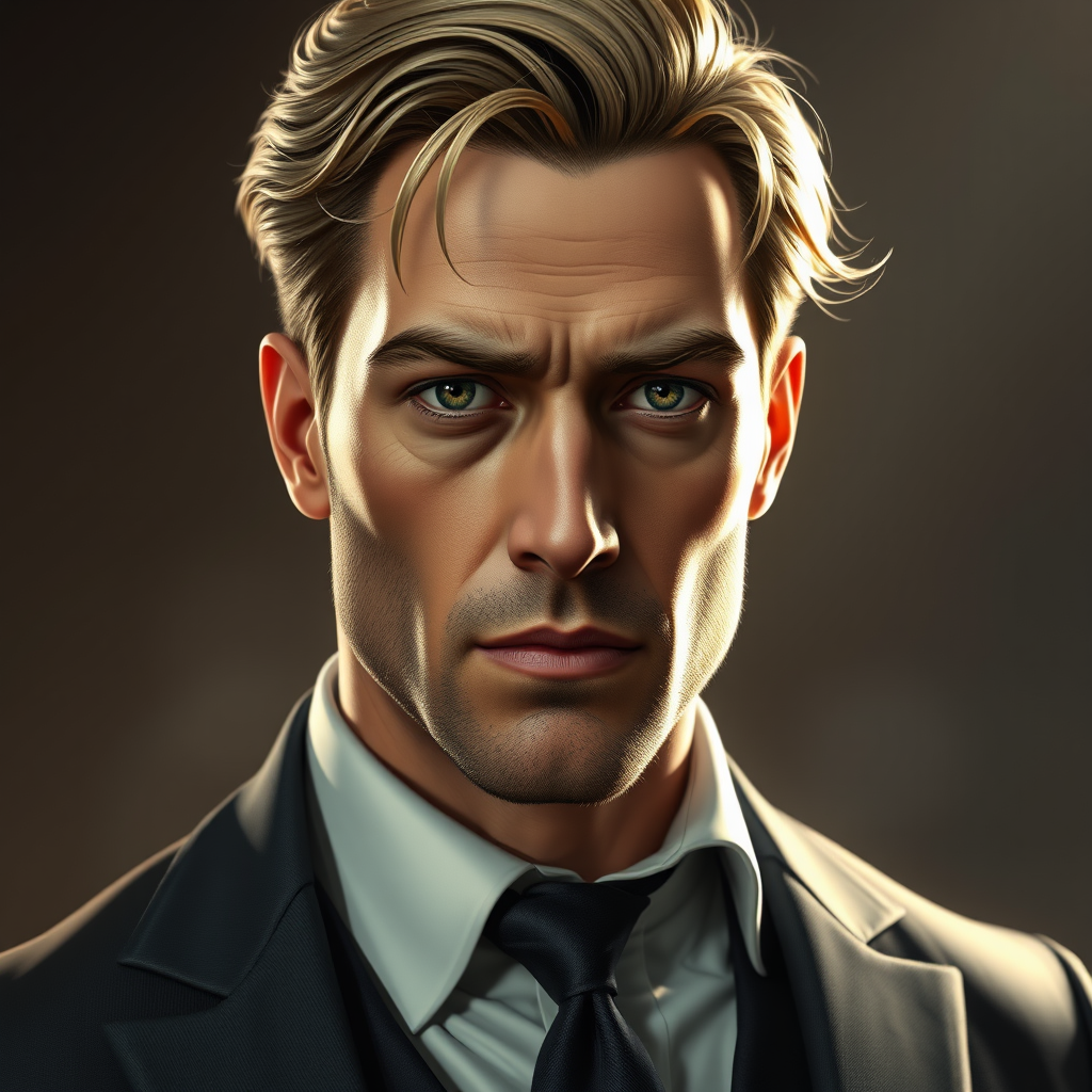 A hyperdetailed concept art portrait in 8k resolution showcasing a man with dark blond hair and a prominent nose, clean-shaven with intricate facial details. He wears a classic, tailored outfit, capturing his upper body and shoulders in a close-up view. His expression is serious, set against a background of dynamic and volumetric lighting that enhances the mood. Inspired by the styles of dmc_kay and WLOP, the artwork employs a triadic color scheme with subtle, creative modifications, integrating a splash of trending art elements to bring the composition to life.