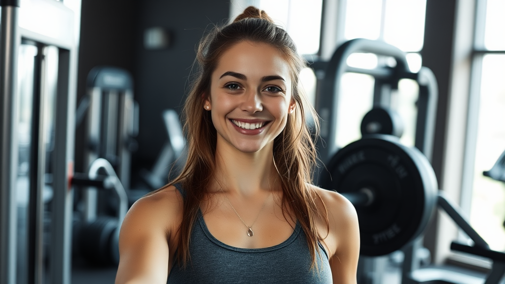 Self-portrait of a young woman at a fitness center, showcasing her vibrant energy and dedication. She's surrounded by various gym equipment, exuding confidence and a sense of accomplishment. The image captures natural lighting that highlights her expression and the dynamic atmosphere, subtly enhancing the contrast to emphasize the determination and positive vibes of the scene.