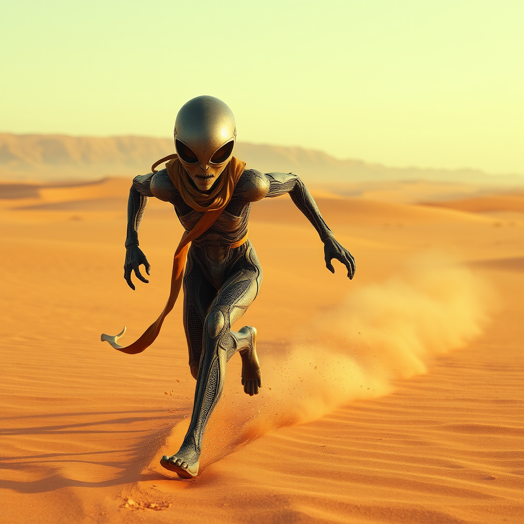 An extraterrestrial humanoid races across an endless desert landscape, sand swirling around as they sprint, their enigmatic mask glinting in the harsh sunlight and concealing an otherworldly visage beneath.