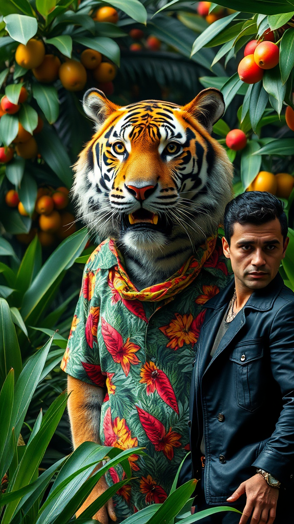 A majestic tiger in a vibrant Hawaiian floral shirt, complemented by a stylish jacket and scarf, stands in a lush jungle setting surrounded by verdant plants and exotic leaves. Nearby, a man clad in a sleek jacket adds an intriguing human element to this striking scene. The composition is reminiscent of an album cover, heavily inspired by the maximalist style of Christian W. Staudinger, with elements of animal photography and the fantastical imagery of L. Frank Baum. The backdrop teems with colorful fruits, enhancing the tropical atmosphere while the panoramic view captures the essence of RAW candid cinema. Utilizing a 16mm cinematic camera, the image is color graded with Portra 400 film for vibrant and realistic tones. The tiger's detailed, textured skin and remarkable detailed pupils are depicted with ultra-realistic precision, visible fuzz and subtle skin imperfections adding authenticity. A vivid, remarkable color palette elevates the overall timeless appeal of this extraordinary tableau.