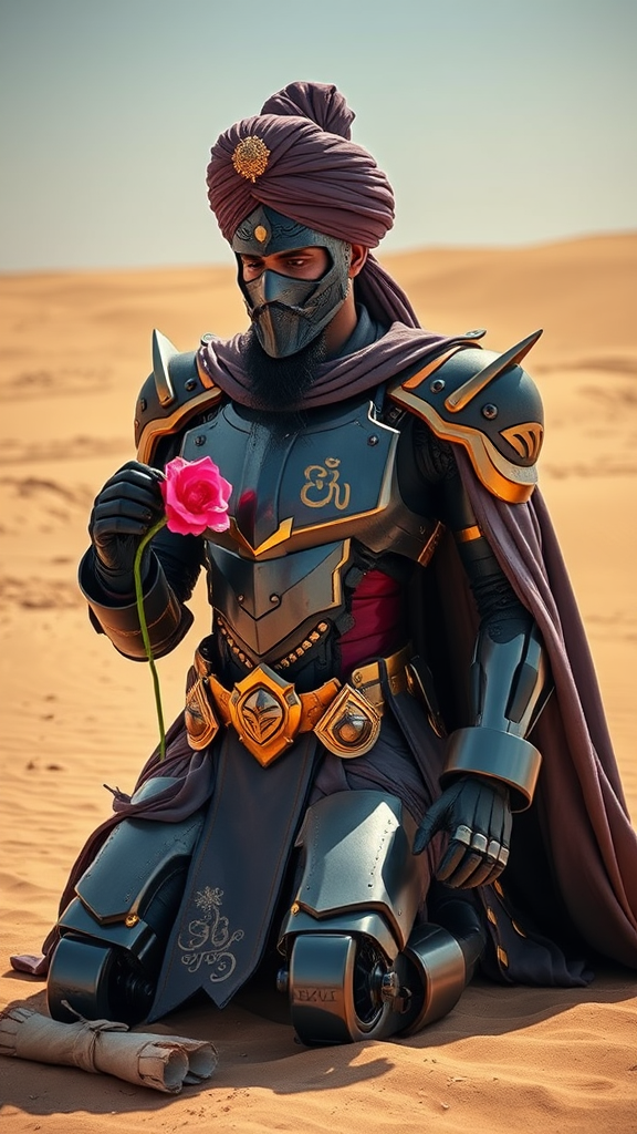 In a desolate desert, an 1800s Sikh king kneels, a vibrant flower delicately in his hand. His regal turban crowns a face shielded by a metal mask, while a long, heavy cape billows behind him. Encasing him is an intricate Japanese mecha exoskeleton gundam suit, seamlessly blending modern history with neo-futuristic technology. The suit, crafted from carbon fibre, is adorned with gold-engraved Punjabi letters, imbuing it with mystical powers. Its design echoes the detailed artistry of Billelis, with influences drawn from Akira, Star Wars, and Akira Kurosawa's cinematic vision. The chestplate is prominently visible, showcasing painstaking attention to detail reminiscent of works by Norman Rockwell, Syd Mead, Boris Vallejo, Jean Giraud Moebius, John Berkey, Eugéne Delacroix, and Rembrandt Van Rijn. Set against a backdrop of an endless, tranquil desert illuminated by natural daylight, the scene romanticizes this crossover of eras and technologies, with blink-and-you'll-miss-it details enriching the visual tapestry.