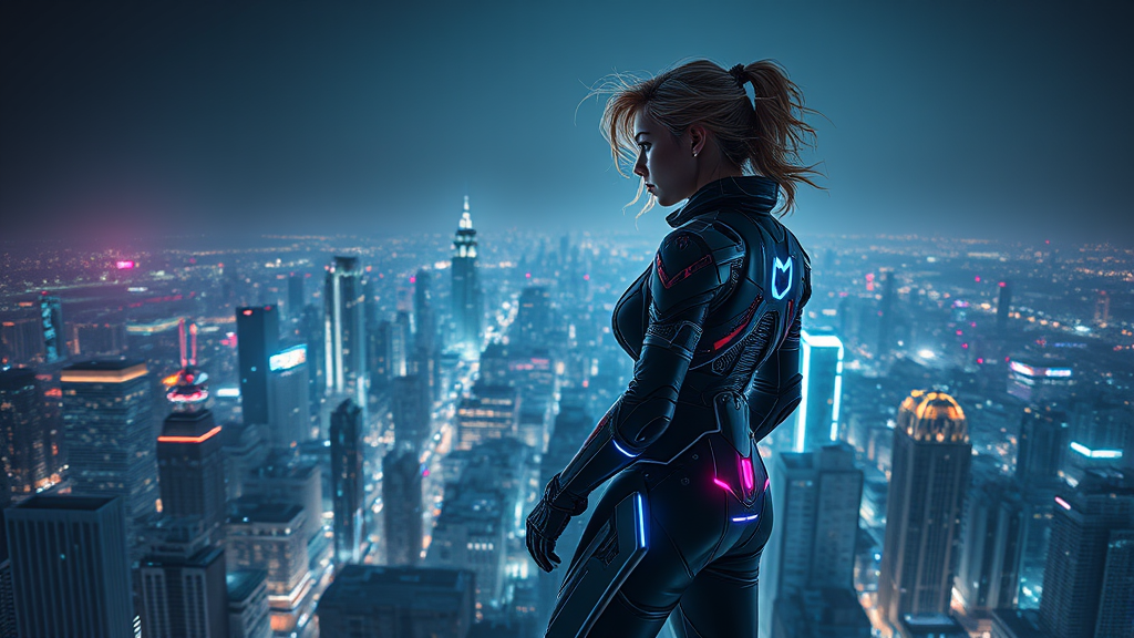 A full-body side view of an ultra-detailed female in futuristic cyberpunk attire stands poised on the edge of a skyscraper, her gaze fixed on the sprawling cityscape below. Neon lights dance across her outfit, casting vibrant reflections on her form. Her attire is an intricate fusion of sleek armor and advanced technology, with glowing circuits tracing along her limbs. The scene is illuminated by dramatic, moody lighting that highlights every hyper-realistic detail, from her wind-swept hair to the complex textures of her ensemble. The city beneath her is a maze of towering structures and flickering neon signs, creating a cinematic back-drop that enhances the 8k realism of the image. Rendered in an expressive style, her presence is both commanding and enigmatic, capturing the essence of a futuristic world.