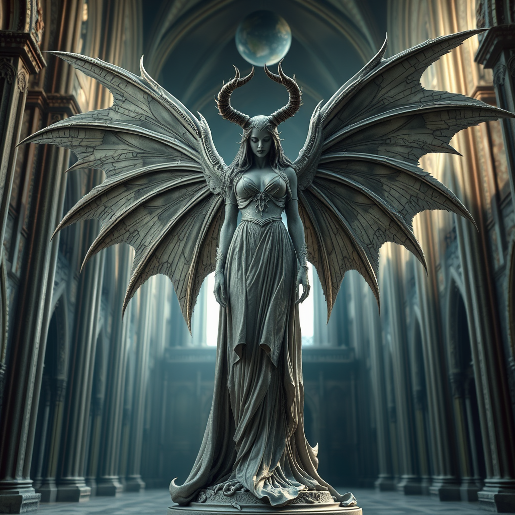 A hyper-realistic sculptural portrayal of an ancient demonic female angel, named Rucifer, adorned in a flowing veil dress with six elongated wings. She stands as a fallen angel under a shadowy halo amidst a vast gothic cathedral, embodying a fusion of gothic and baroque stylistic elements. The sculpture is ornate and intricately detailed, echoing the signature style of Guillermo del Toro. This full-body portrait captures the essence with a low contrast, emphasizing epic perspective and cinematic storytelling. Rendered in ZBrush with octane render and volumetric light, it showcases cinematic lighting and finely tuned composition, mirroring the photorealism achieved through Unreal Engine 5. The scene, depicting dark epic tones, embraces the technique of ultra-detailed precision, guided by the rule of thirds, with the planet Earth subtly illuminating the background in an 8k resolution, adding to the mystique and grandeur of the bone-like texture and artful craftsmanship.
