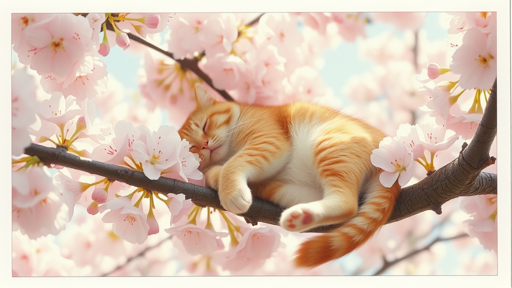 A Polaroid picture captures a ginger tabby cat dozing on a blossoming cherry tree, its hind legs playfully dangling, with soft cinematic lighting casting gentle shadows through the petals.