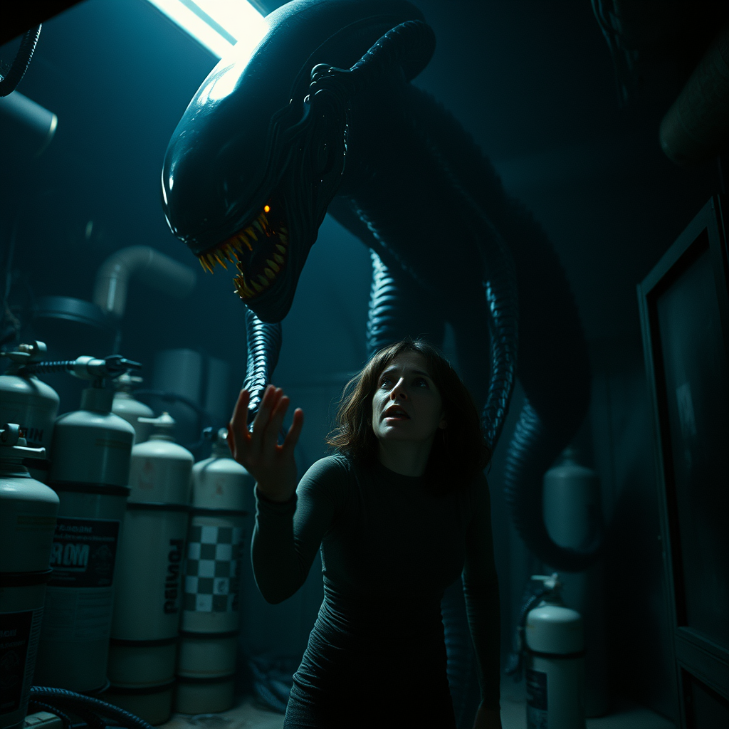 A cinematic scene unfolds with a horrifying alien towering over the distressed Ellen Ripley, portrayed by Sigourney Weaver, who is frozen in terror as she desperately attempts to flee its menacing grasp. The background is cluttered with industrial equipment, including oxygen tanks, reflecting the grittiness of their dark, confining environment. The lighting is dim and atmospheric, casting eerie shadows that emphasize the tension of the moment. This wide shot captures the raw, intense emotion, reminiscent of an authentic Sony ALPHA 7R V photograph, with a distinct film-like quality and dramatic, cinematic lighting that enhances the suspenseful ambiance.
