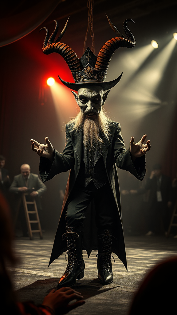 A devilish and sinister master showman leads a dark and grotesque circus show, filled with horror elements and intricate designs. The atmosphere is heightened with dramatic lighting, creating a photorealistic and cinematic experience. The showman is a curious figure with two faces, a long beard, and a big head, adorned in pointed, elaborate footwear. The scene is imbued with surreal elements, like shoe laces intertwined with unusual features such as fused fingers and multiple heads. The audience is drawn into a world of disfigured shadows and blurred visions, captivated by the uncoordinated and mutated body shapes on display. Every aspect of the performance bends reality with unnatural and fantastical appearances, leaving a lingering sense of awe and bewilderment. The entire spectacle is a monochromatic masterpiece, echoing the aesthetics of an old, low-resolution film reel but with an eye-catching modern twist, maintaining the eerie allure of a forgotten, otherworldly circus.