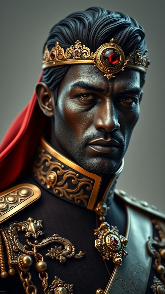 Portrait of Paul Atreides, Elegant, Royal Military Attire, Realistic, Highly Detailed, Ornate Design, Sci-Fi Elements, Ultra-High Definition, High Dynamic Range, 8K, Model: Dark Sushi Mix - Vivid Colors, Create an arresting visual with elements of regality and sci-fi influence, avoid any duplicates or disfigurations, ensure human features are proportionate and realistic, maintain clear and focused imagery without artifacts or distortions, results should be a clean and immersive portrait capturing both intricate details and a sense of futuristic allure.