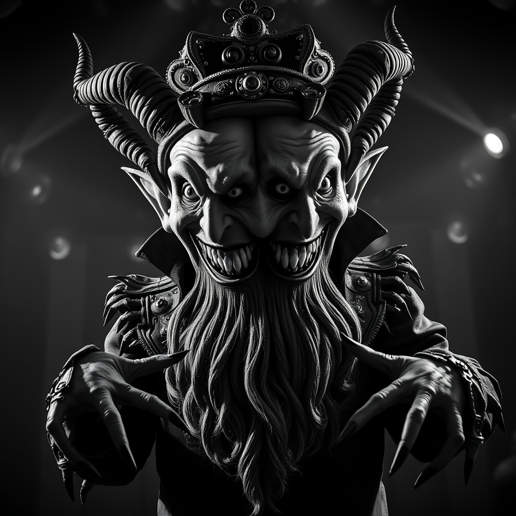 A devilish master showman with a twisted grin leads a mysterious and dark circus show. His dual personalities are reflected in his two faces, each with eyes full of madness. He sports an intricately detailed costume with dramatic lighting amplifying his larger-than-life presence. The sinister atmosphere is heightened by disfigured elements, like fused fingers and elongated, pointed footwear. His big head is crowned by a long, winding beard that seems alive. Despite the chaotic aura, each detail is intricately designed, contributing to the grotesque beauty of the scene. The black-and-white palette casts an eerie, timeless quality over the photo-realistic tableau, blurring the lines between reality and nightmare. This cinematic spectacle reveals elements of mutation and anatomical oddities, creating an unsettling yet mesmerizing vision that draws the audience into his world of horror.