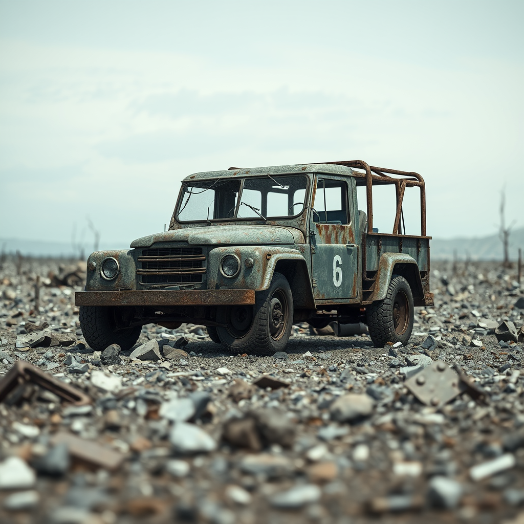 A desolate and barren landscape scattered with rubble and debris. A vehicle stands ominously in the shadows, its metal body worn and rusted from years of neglect. The tires are flat, and the windshield is shattered. The scene is rendered in detailed CGI with a focus on the gritty realism of its low resolution. The overall composition highlights imperfections—text errors, missing elements, and distorted anatomy, creating an unsettling atmosphere. The visual echoes a sense of decay, with blurred and misshapen forms, evoking a haunting beauty in its ugliness.