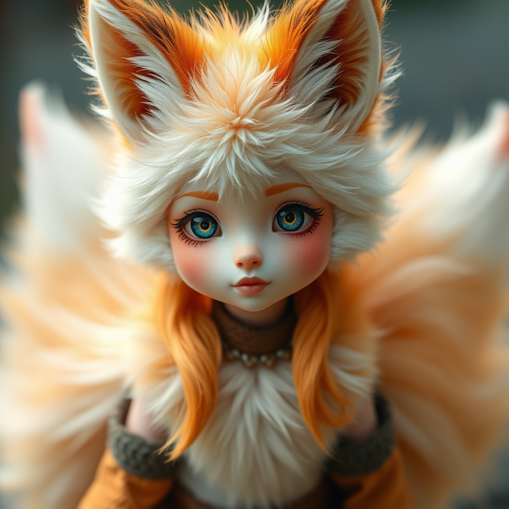 Fluffy nine-tailed fox girl, hyper realistic, professional photography, real, 8k resolution, soft natural lighting, CGI influence, 3D animated style, doll-like features, cartoon and anime fusion, illustration, digital painting, textural depth, cropped composition, subtle JPEG artifacts, attention to detail, nuanced imperfections like skin spots and blemishes, imaginative yet grounded anatomy, blending fantasy with realism.