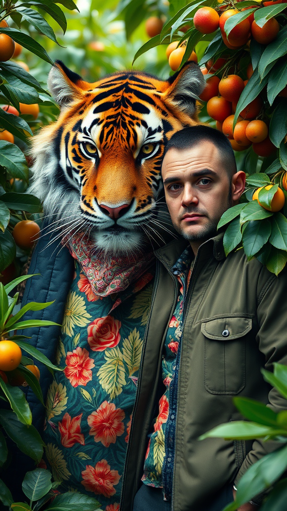 A striking tiger dons a vibrant Hawaiian floral shirt beneath a stylish jacket and scarf, nestled amidst the lush greens of a jungle teeming with leafy plants. Beside the tiger stands a man in a similar jacket, evoking a style reminiscent of Christian W. Staudinger, captured as if for an album cover. Embracing maximalism, the scene is infused with touches of eyeliner and a quirky fking_scifi vibe, reminiscent of L. Frank Baum's storytelling. A vibrant array of fruit subtly embellishes the background, offering a panoramic view. Shot with a 16mm cinematic camera and color graded with Portra 400 film, the image captivates with ultra-realistic textures and remarkable color. The tiger's skin is textured with noticeable fuzz and dry skin details, and its pupils are strikingly detailed. The candid, cinema-raw look lends the scene authenticity, framed like a living canvas. Avoiding unwanted elements like cloning or distorted proportions, the image maintains its vibrant, realistic charm without leaning into cartoonish or digital render aesthetics.