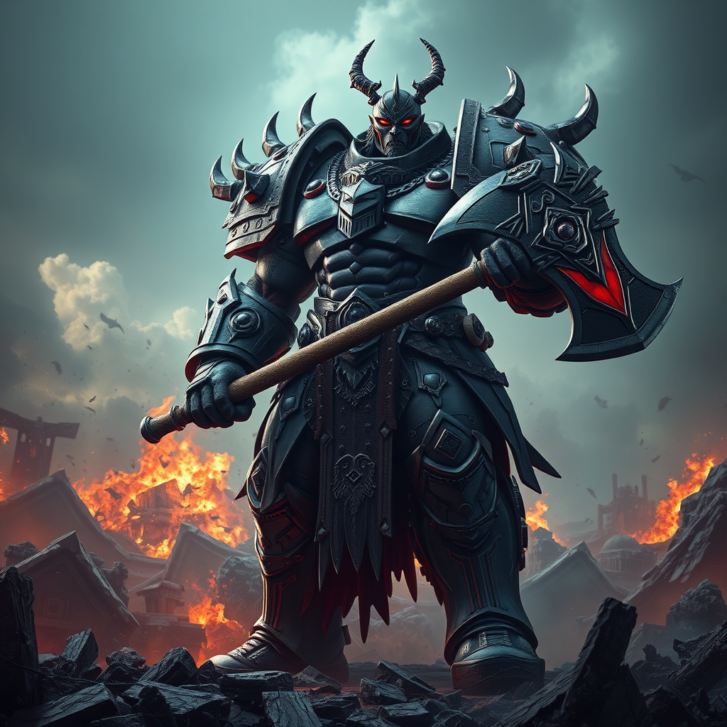Photograph Worldbreaker Sion amidst a chaotic apocalyptic landscape, showcasing his massive towering physique, intricate armor, and signature axe with advanced lighting and dynamic posing. Highlight the details of his fierce unrelenting expression to convey power and destruction. Use a muted desaturated color palette with pops of red and black to capture the essence of Worldbreaker Sion's catastrophic world-ending nature, making small creative modifications while keeping the core concept intact.