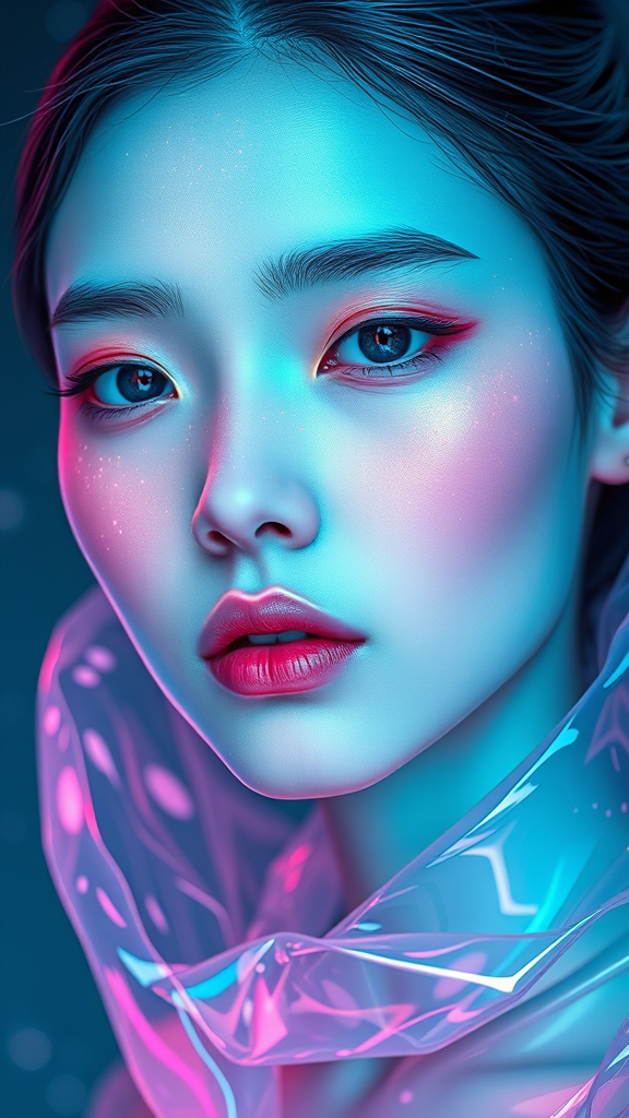 Three quarter portrait of a cerulean-skinned figure with a rose-tinted face enveloped in iridescent fluids, featuring futuristic sci-fi aesthetics and hyper-realistic portraiture, imbued with Asian influences. The composition is illuminated with soft white and pastel pink hues, showcasing a shiny and glossy texture with photorealistic precision, set in an aurorapunk world. Unique elements include subtle bioluminescent patterns that dance across the skin, adding an ethereal allure, while the background shimmers with hints of distant nebulas.