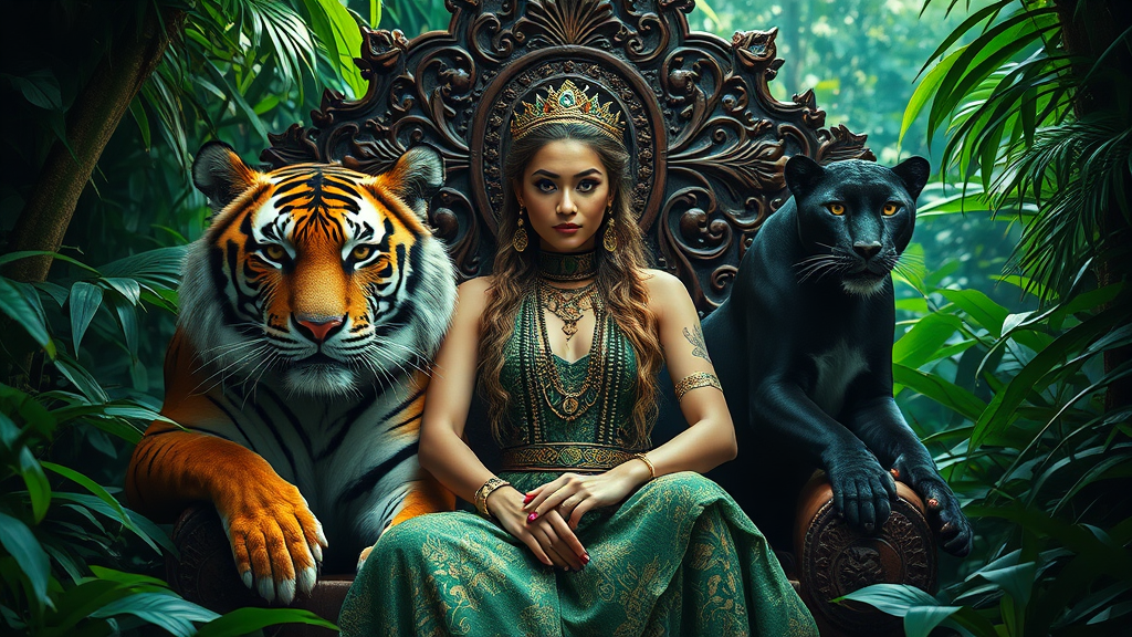 Ethereal π goddess accompanied by a majestic tiger and sleek panther, seated gracefully on an intricately carved jungle throne amidst a vibrant, lush wilderness. Her strikingly detailed face is illuminated by cinematic lighting, embodying the essence of junglecore. Captured in a character portrait style reminiscent of Annie Leibovitz's renowned photography and expertly retouched with Pratik Naik's precision, this scene radiates an enchanting blend of power and serenity, with vivid greenery and soft shadows creating a captivating, harmonious atmosphere.