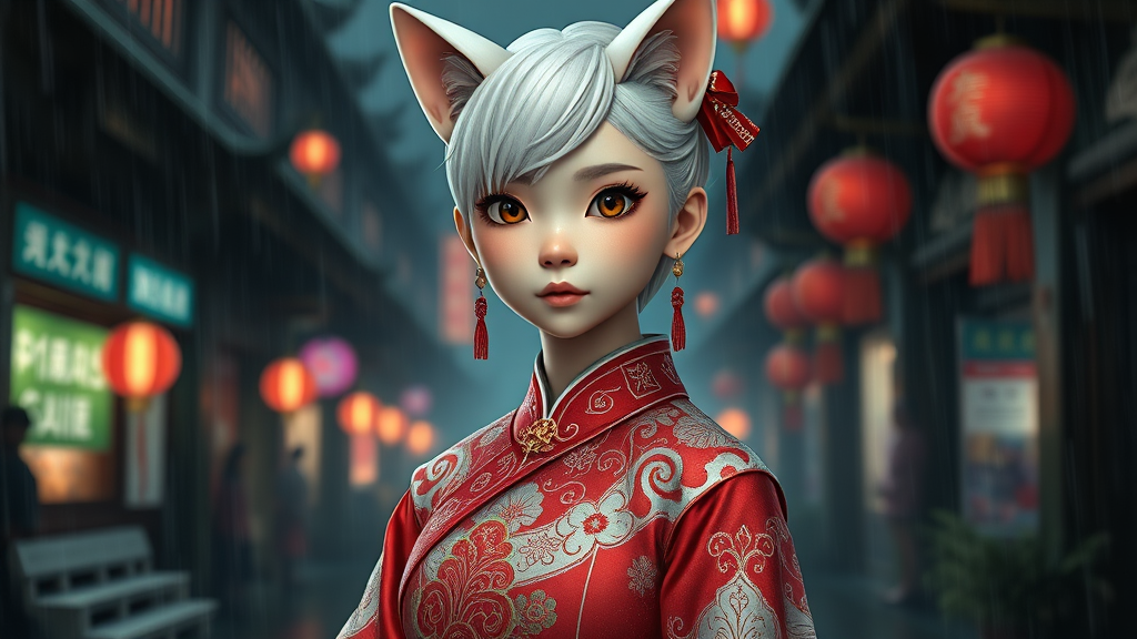 White-haired 12th-century cute cat girl in a traditional Chinese dress, featuring mesmerizing eyes and an olive skin tone. She has short, white hair and a petite yet toned body, with small breasts. She wears an intricate red and white qipao, captured in hyperrealism with cinematic lighting and exquisite detail, producing a breathtaking 8k UHD image. She is set in a dark, rainy city, where depth of field and lumen reflections offer a photographic quality. The stunning CGI environment, rendered in 3D like a doll with Octane, subtly incorporates imperfections like blurry or fuzzy elements, with slight creative twists respecting the core theme.