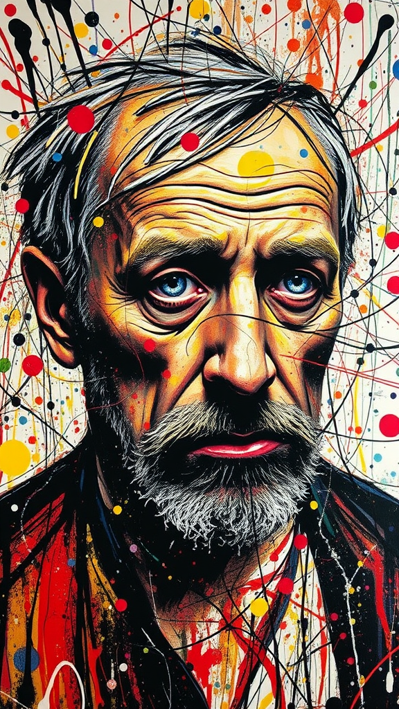 Jackson Pollock's self-portrait, an abstract whirlwind of vibrant splatters and bold, chaotic lines, captures the tumultuous intensity of his inner world. Flecks of color blend and clash across the canvas, creating a dynamic tapestry that pulses with emotion and energy, each stroke reflecting the passionate and unconventional spirit of the artist.