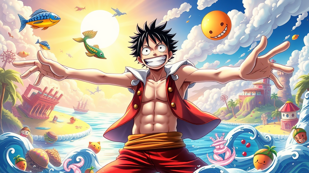 An imaginative, vibrant scene bursts with life as Luffy from One Piece, in his legendary God Nika form, becomes the center of this visually captivating and hilarious masterpiece. With his pristine, luminous white skin glistening against the whimsical backdrop, Luffy's Gear 5 transformation radiates an aura of mischief and wonder. His exaggerated rubbery limbs stretch absurdly in all directions, defying logic and evoking laughter with their comical elasticity. The setting morphs playfully between worlds, blending tropical islands with surreal, cartoonish landscapes and bright, swirling colors. Luffy’s face beams with uncontainable joy and determination, while his eyes gleam with playful intent. Amidst this artistic cacophony, small creative tweaks enrich the imagery: fish fly like birds, clouds twist and loop like balloon animals, and the sun sports a cheeky grin. This exuberant rendering pushes artistic boundaries, capturing the essence of Luffy’s whimsical spirit and the boundless potential of his rubbery prowess.