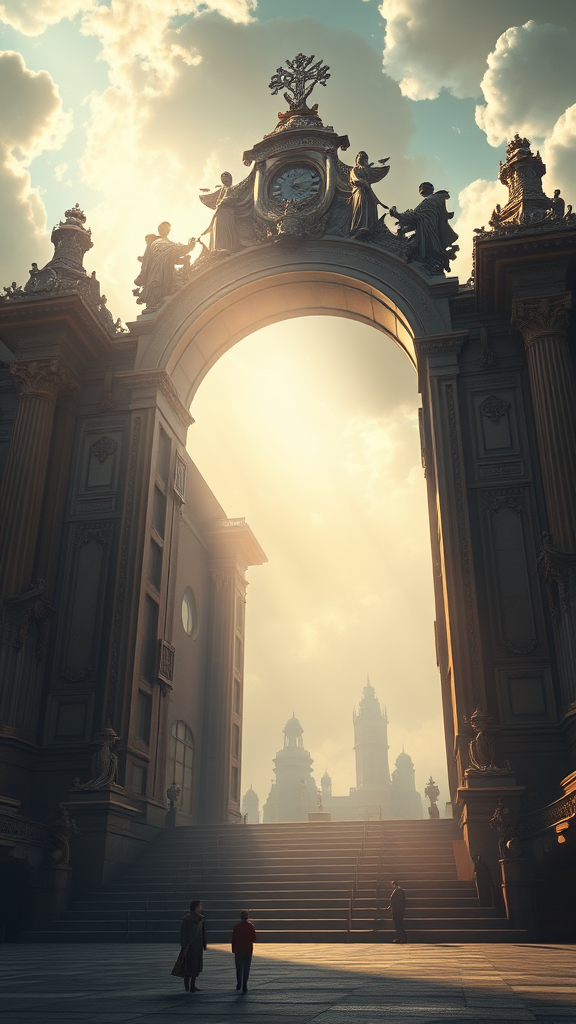 A cinematic depiction of the majestic gates to heaven, intricately detailed and rendered in 8k realism. The atmosphere is ethereal and dreamlike, styled with influences from Ivan Aivazovsky, Peter Mohrbacher, and Greg Rutkowski. Volumetric light cascades through the gates, casting a broad, divine illumination over the scene. The composition is reminiscent of an exquisite oil painting, blending elements of fantasy and sci-fi realism. A creation suitable for premium prints, capturing the grandeur with the precision and surreal quality of an unreal engine render.