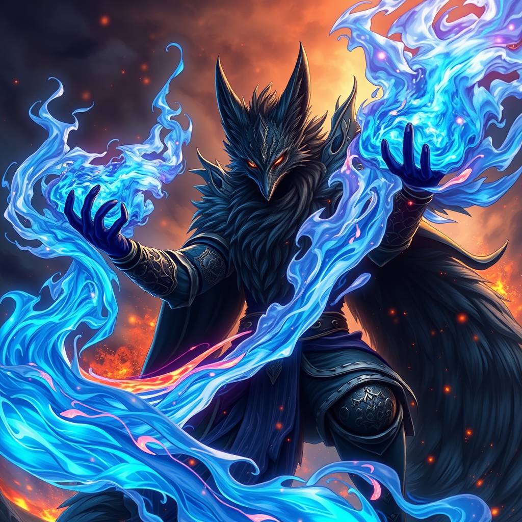 Mighty dark fox wielding deep indigo flames of raw energy, anime-style, 8K resolution, sorcerer humanoid male prince of the abyss dominating the battlefield, surrounded by azure infernal flames and radiant sparks in the background, amidst an apocalyptic scene, vivid and colorful, intricately elegant, digital illustration, breathtakingly scenic, hyper-detailed, 8K, set against a backdrop of a ferocious thunderstorm.