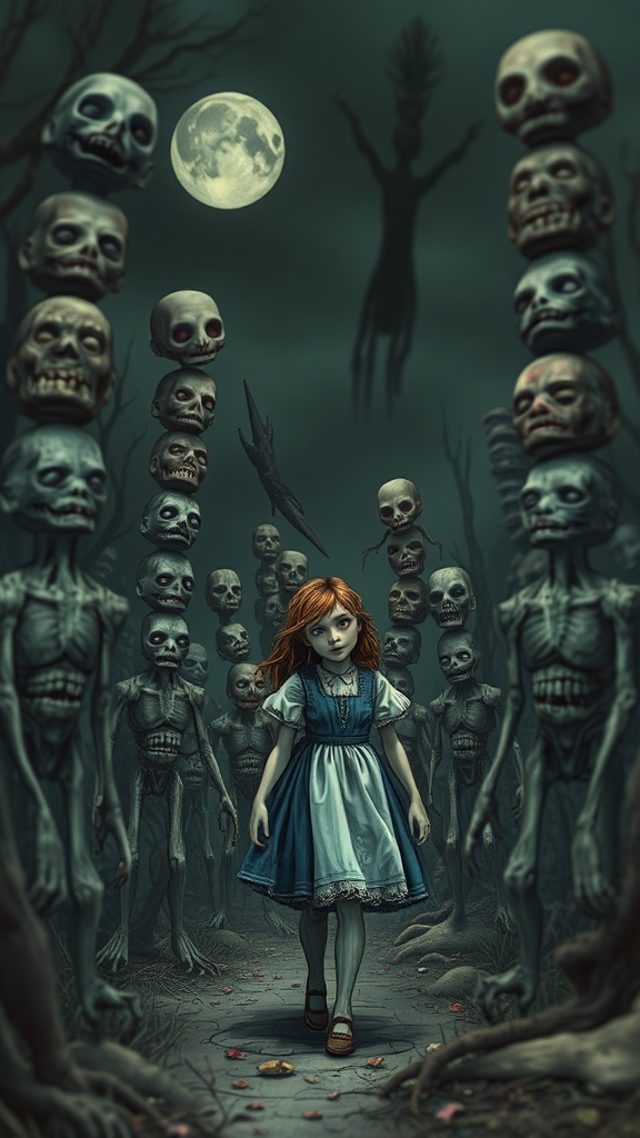 Alice finds herself in a twisted realm, where the macabre meets the fantastical in a world reminiscent of a Tim Burton dreamscape. Disjointed zombies lurk amid a dark, eerie landscape, their forms a chaotic blend of stacked torsos and totem poles. The figures are a bizarre collection of poorly drawn anatomy, featuring grotesque mutations with extra limbs, missing limbs, and oddly floating appendages. Limbs appear disconnected, embodying a disturbing dance of amputation and grotesque mutation. Despite the ugliness, there's a surreal, blurry beauty in the chaos—a nightmarish yet captivating scene where the rules of reality have been obscured, leaving Alice to navigate this unsettling landscape where nothing is as it seems.