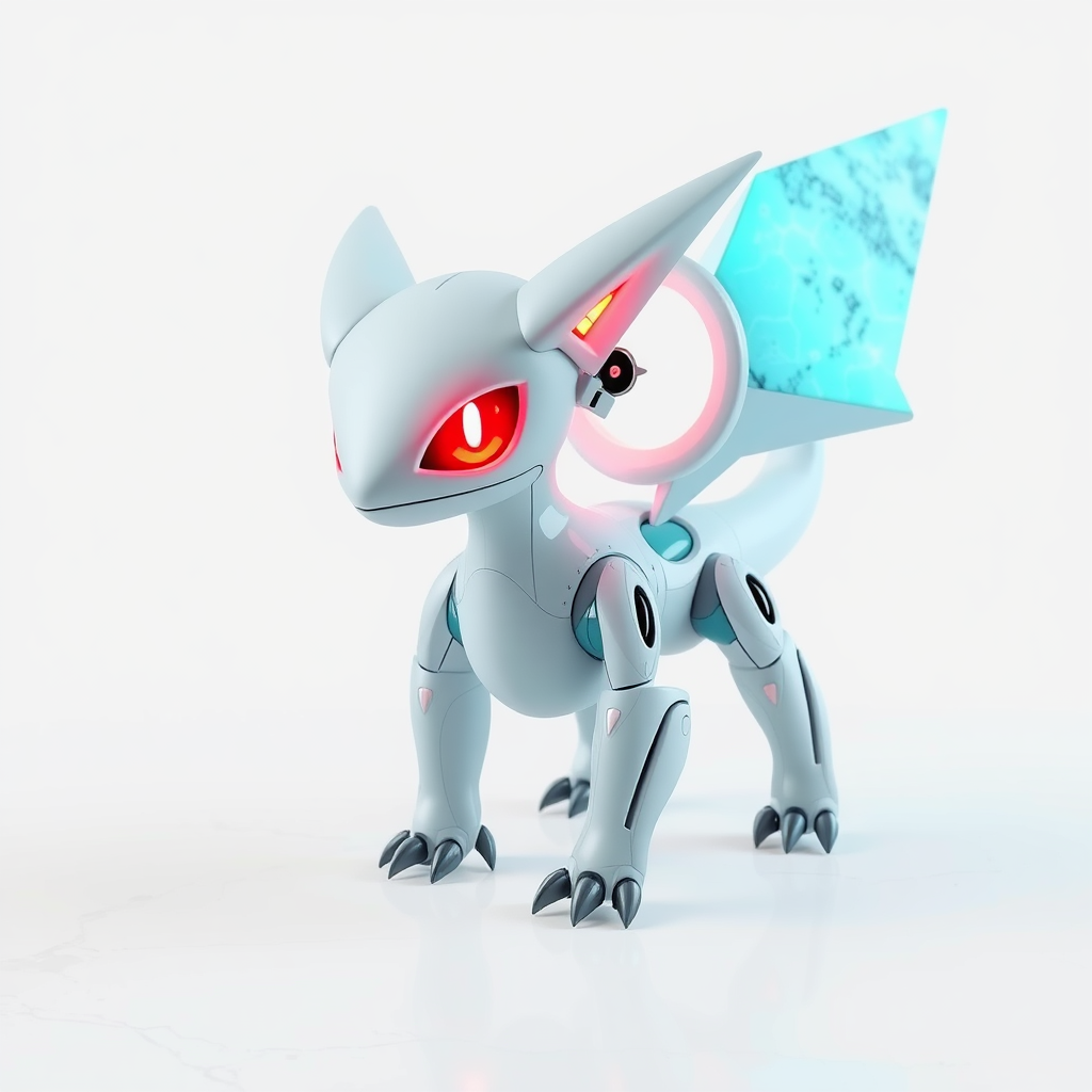 full body, glowing eyes, pokemon-like creature, ruby red eyes, simple setting, solo, white backdrop, chromatic shift, luxurious marble texture, majestic light blue granite elements, four-legged, advanced technology-inspired, sci-fi, stylized 3D appearance, elegant, sleek design, clarity, balanced composition.