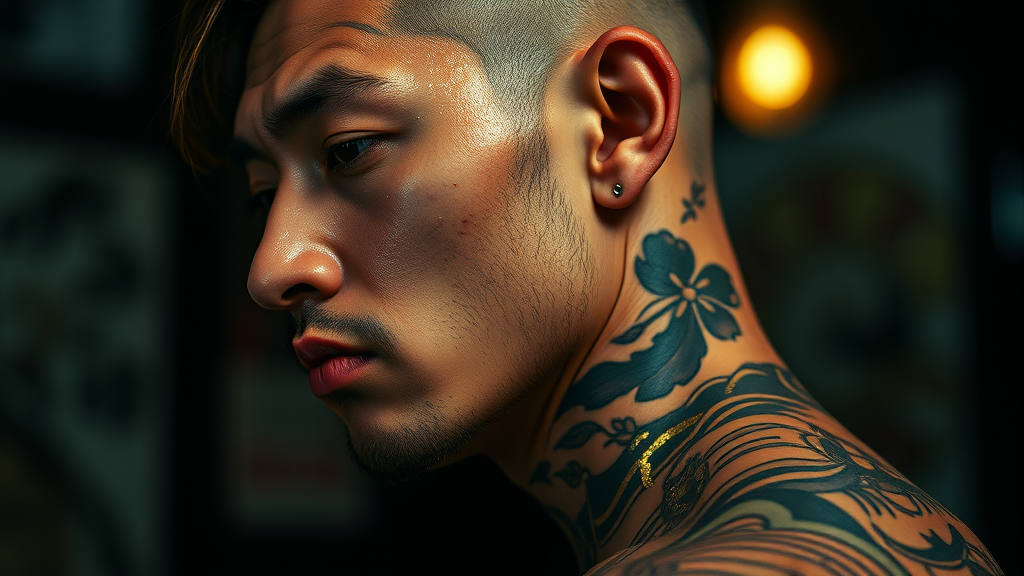Hyper realistic photograph of a Japanese yakuza tattoo with a futuristic punk twist, featuring intricate gold tattoo lines. Captured in side profile using a Leica 85mm lens on Kodak Portra 800 film, the scene is shot with chiaroscuro lighting at f1.4, highlighting the clean-shaven, serious expression of the subject. The cinematic composition boasts epic detail with a 4k resolution and a rich, detailed bokeh, evoking the dark, moody atmosphere of an HBO drama.