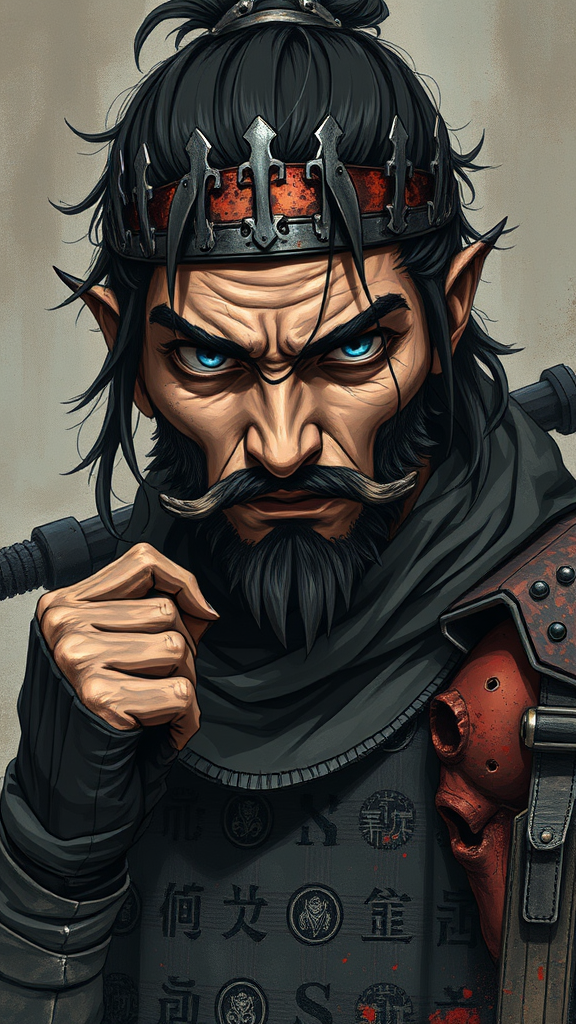 A digital wallpaper portrait depicting a rugged cyberpunk samurai in a style reminiscent of anime and Marvel comics, featuring a dark and muted color palette. The composition is both brutal and epic, with dramatic, detailed digital painting. The image is cluttered with low-quality elements like jpeg artifacts and rough text, giving it an ugly and chaotic feel. The character is portrayed with poorly drawn features including hands, face, and body, showcasing bad anatomy and distorted proportions. The samurai appears with odd mutations, deformed limbs, and disfigured features, with grotesque proportions like extra limbs or missing body parts. The artwork is filled with imperfections such as a long neck, cloned face errors, and random additions like camera elements, names, signatures, watermarks, or logos. The overall result is an intense yet visually jarring portrayal of a dystopian samurai.