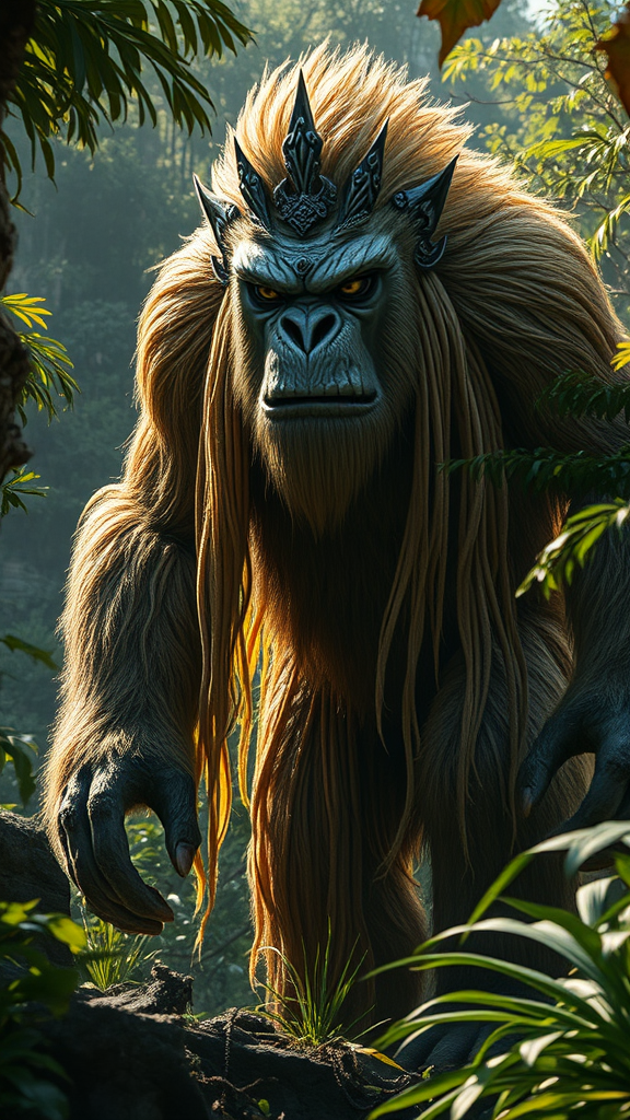 A mysterious Bigfoot emerges from the dense jungle, the creature's powerful growl echoing through the ancient ruins. Resembling a guardian of the Mayan tribes, it stands in majestic splendor, its silver eyes glowing with intelligence and purpose. Golden hair cascades down its muscular form, catching the dappled sunlight, creating a striking contrast against the verdant backdrop. In full detail, every aspect of this fantastical being is adorned with intricate and exquisite decorations, reflecting a rich cultural style. Its realistic 3D micro details lend an almost ethereal quality, captivating the observer with its presence.