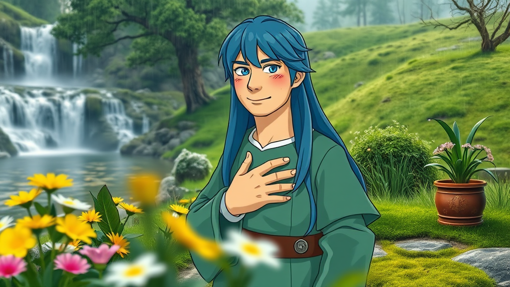 Stunning hyperrealistic HDR 8K detailed portrait photo of a human-like Abraham Simpson with blue eyes and hair, featuring a blurry foreground. The scene includes blush stickers, a commentary request, and English text. The setting is outdoor with a green theme, capturing a hand on the chest, long hair, looking at the viewer with a smile. Surrounded by nature, there's a mix of flowers - yellow, pink, white, and red, along with a potted plant. The landscape features a rain-soaked wetland, waterfall, and sunlight peeking through the sky with a tree and grass. The character, in an official alternate costume, stands amidst this scenery, with the virtual Youtuber elements inspired by Hololive English, Takanashi Kiara, and blended with a touch of traditional media. Snow, moss, and a star symbol are subtly integrated, creating a harmonious blend of winter and day. The photo maintains its high resolution and realism without being distorted or altered in negative aspects.
