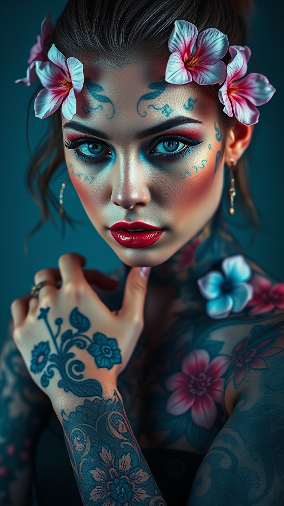 A tattoo artist adorned with vibrant blue tattoos and delicate flowers cascading across her skin, embodying a futuristic fantasy aura. Her intense gaze captivates the viewer, framed beautifully in a high-resolution oil portraiture styled with influences from rococo aesthetics. The color palette dances between light red and teal, creating a dynamic contrast. The composition has a dark yet explosive energy, featuring a tattooed girl confidently posed in a photo shoot, digitally manipulated to emphasize intricate details. Inspired by the works of Tanya Shatseva and Daniel F. Gerhartz, the portrait blends dark pink with soft light blue tones, presenting an intricate and mesmerizing image. The setting is enhanced by ultra-high-definition imagery and oil portraiture's delicate texture, capturing the essence of the subject with a unique creative twist.