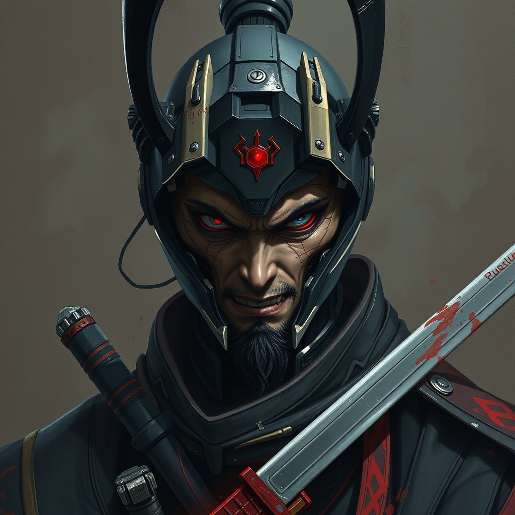 digital wallpaper portrait of a formidable cyborg samurai supervillain, exuding a badass anime vibe, influenced by comic book aesthetics, 8k resolution, reminiscent of marvel comics, set against a dark backdrop with muted tones. An epic composition that is both dramatic and emotionally profound. This digital painting is highly intricate, with a focus on creating a visually striking and complex character. Despite its detailed rendering, it bears qualities of low fidelity, such as jpeg artifacts, conveying a raw and gritty appearance. The figure may exhibit unusual features such as mutated or deformed characteristics, resulting in a unique, albeit distorted visage. The anatomy and proportions are deliberately flawed with elements like elongated necks, extra or missing limbs, and disfigured or cloned facial features. The image is intentionally unrefined, capturing the essence of chaos and imperfection. Elements like text, camera effects, and signatures are integrated, adding to the rough, unpolished aesthetic.