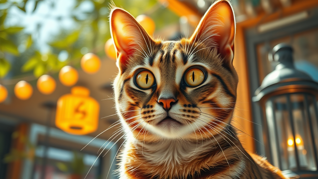Bengal cat with vivid yellow eyes, illuminated by a bright sunny day, showcasing realistic, detailed fur in a photorealistic style. The scene is filled with intricate details, enhanced by ray tracing techniques, exuding a cinematic quality. Neon lights add a modern touch, while a nearby lantern casts a warm glow. Captured in third person view, the composition highlights natural textures and realistic hair under natural lighting. Photographed with a Nikon D750, the image is presented in 8K HDR, ensuring high definition and vibrant colors. Aspect ratio of 9:16 enhances the image's vertical perspective.