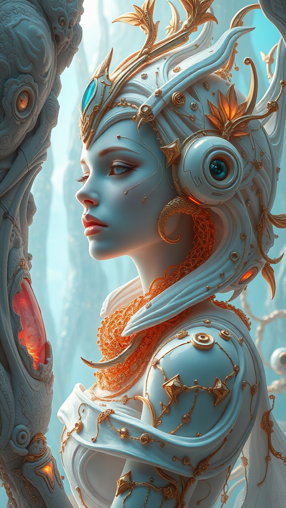 Visual fiction fantasy by a visionary illustrator, inspired by Christiano V and reminiscent of Franciszek Starowieyski's style, infused with gold and cyan hues. Hyper-realistic sci-fi elements blend with romantic, organic sculpting techniques, reminiscent of Android Jones, creating a dreamlike convergence of romantic fantasy and futuristic artistry. The composition, with an aspect ratio of 32:31, showcases an ethereal and enchanting world where imagination meets reality, capturing the essence of a surreal romantic journey.
