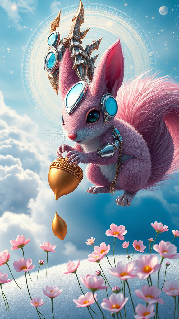 Cyber Bling masterpiece from the 'art of control' collection by Jasper Harvey, featuring futuristic optics with shimmering silver and gold hues, intricately detailed facial features amidst swirling vortexes, and whimsical 3D cyborgs crafted from dazzling crystals. The scene is set on a serene blue cloud hosting a playful, pink-furred squirrel, clutching a gleaming golden acorn that slips from her paws, descending gracefully into a pristine white clearing adorned with delicate pink snowdrops. Style raw, maintaining a sense of vivid imagination and originality.