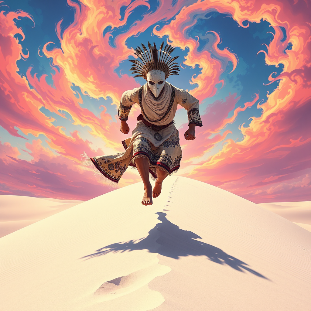 A man sprinting atop a vast, pristine white sand dune, his gaze fixed intently on the camera. He wears a striking white tribal mask and flowing, oversized garments adorned with elaborate tribal patterns. The scene is dreamlike, bursting with vivid, bright colors that blend seamlessly into a futuristic anime aesthetic, reminiscent of a Studio Ghibli masterpiece. The man radiates energy and mystique against the backdrop of an expansive, kaleidoscopic sky, where colors swirl and dance, adding to the surreal ambiance.