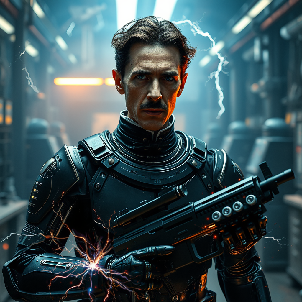Nikola Tesla in a sleek cyberpunk electric robotic armor, revealed face, standing in a high-tech laboratory filled with an air of mystique, photorealistic details accentuating Tesla's expressive features. Electric sparks dance around him, highlighting the cinematic lighting that bathes the scene. The post-apocalyptic futuristic setting stretches wide, displaying intricately forged armor and a futuristic energy weapon, an electricity-infused rifle, in his grasp. The atmosphere is cinematic and vivid in HDR, depicted in 8k resolution, with a dramatic 3:2 aspect ratio.